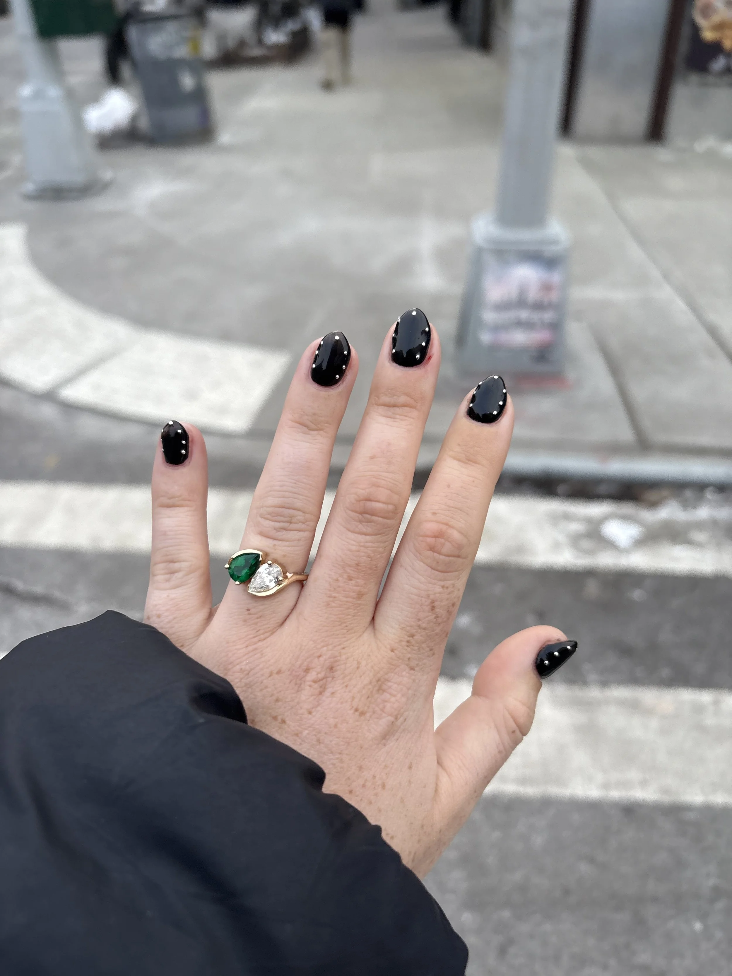 While I used to be a powder/dip girl, I one day had to do tips for some broken nails and my nail girl convinced me to try builder gel. While I am by no means an expert, in my experience, when getting dip powder the nails become extremely solid and if they break they crack quite painfully whereas with the builder gel its more of a liquid setting and it’s more slight chips on edges then full on cracking off the nail. The nails pictured are my real nails, no tips, with builder gel (using a blue light between applications) then black (unsure the specific color she picked it) and little 3D flat silver disks.